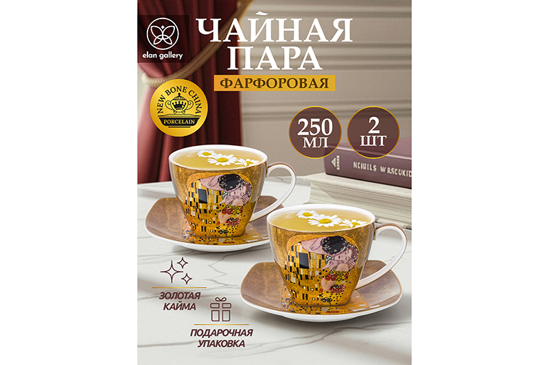 Набор "Поцелуй" состоит из 2-х чайных пар: 2-х чашек объемом по 250 мл каждая и 2-х блюдечек. Набор украшен роскошными репродукциями картины "Поцелуй" Густава Климта. Чайные пары выполнены из высококачественного фарфора New Bone China. Это фарфор нового поколения, не уступающий традиционному костяному по качеству, но при этом гораздно более экологичный в производстве. Чайные пары украшены золотым окаймлением. Чайные пары нельзя использовать в микроволновой печи и посудомоечной машине. Набор из 2-х чайных пар поставляется в подарочной картонной упаковке и сможет стать приятным подарком для ваших родных и близких! /