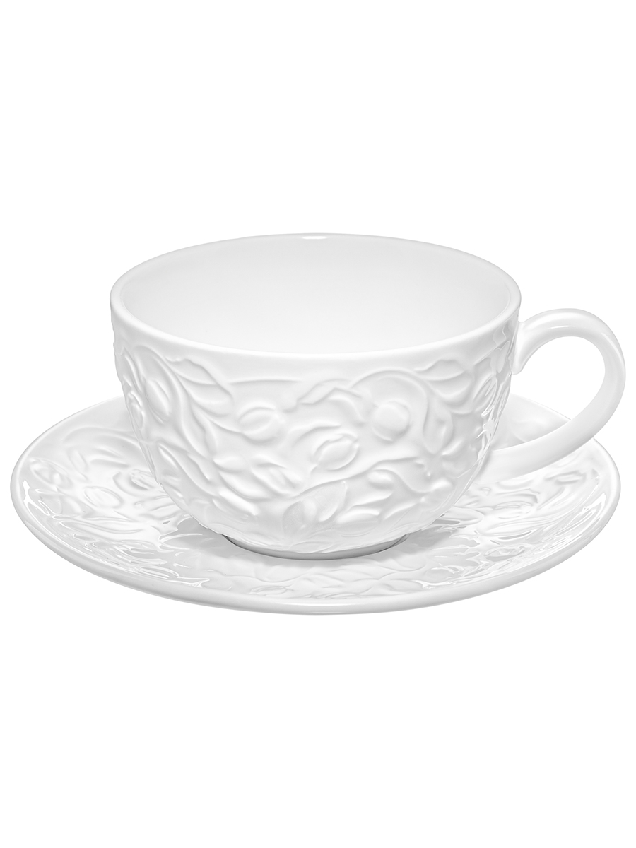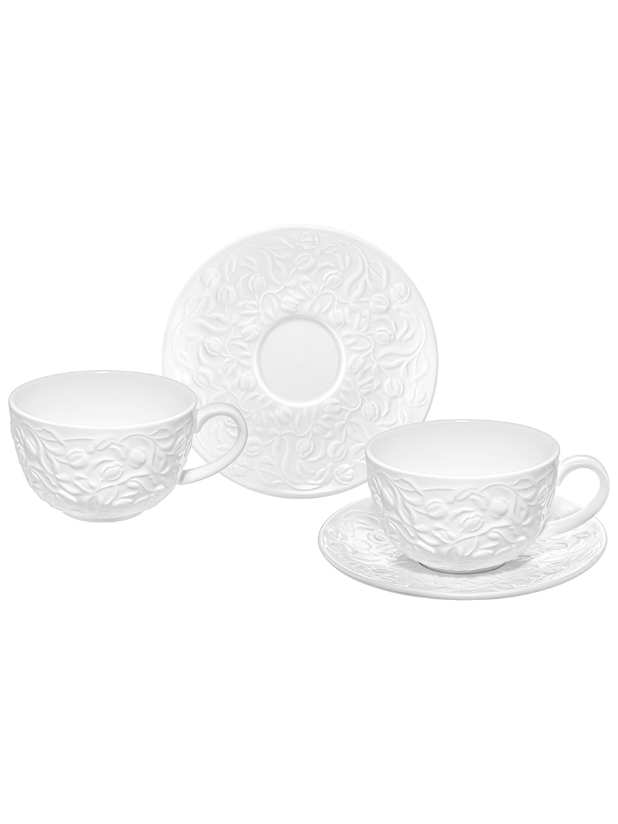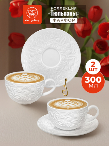 Набор 2 чайных пар Elan Gallery "Тюльпаны" выполнен из белого фарфора, украшен изящным рельефным узором. Объём каждой чашки – 300 мл, размер – 13х10х6,5 см. Размер каждого блюдца – 16х16х2 см. Кружки с рельефом подходят ценителям чая и кофе, которые любят пить из красивой посуды. Это идеальный вариант для того, чтобы согреться горячим глинтвейном зимой и освежиться прохладным лимонадом летом. Чашки с блюдцами для десерта украсят ваш стол своим эстетичным дизайном как на праздник, так и в будни. Используйте блюдце как подставку для чашки, чтобы порадовать гостей изящной сервировкой. Положите на десертную тарелку кусочек торта, домашнего пирога или пирожное. Небольшая тарелочка подойдёт не только для десерта, но и закусок: сырной нарезки, сырокопчёной колбасы или свежих овощей и зелени. В отличие от керамики фарфор не впитывает цвет напитков, легко отмывается, поэтому сохраняет свою белизну долгое время. Не рекомендуется применять абразивные моющие средства. Беречь от резких перепадов температур и механических повреждений. Комплект можно использовать в микроволновой печи и посудомоечной машине. Поставляется в красивой картонной коробке, поэтому вам не понадобится дополнительная подарочная упаковка, если вы решите преподнести сюрприз. Изящный набор на 2 персоны станет приятным подарком на любой праздник и добавит эстетики каждому чаепитию. В коллекции бренда Элан Галерея представлено много стильных товаров для дома, в том числе всё для создания красоты и уюта на кухне. Выберите вариант на свой вкус!