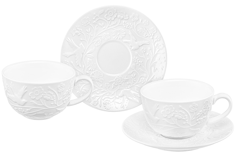 Набор 2 чайных пар от Elan Gallery из серии «Райский сад» предназначен для эстетичной сервировки стола. Размер каждой чашки – 13х10х6,5 см, объём – 300 мл. Размер каждого блюдца – 16х16х1,8 см. Выполнены из высококачественного белого фарфора и украшены изысканным рельефным узором. Поверхность изделий овивают тонкие лиственные и цветочные веточки, возле которых порхают выразительные птицы. Фарфор не впитывает цвет напитков и легко отмывается, благодаря чему надолго сохранит свою белизну. Милые декоративные кружки помогут провести множество чайных и кофейных застолий в большой и приятной компании. Каждая чашечка поможет насладиться неторопливым завтраком с капучино и латте, а также уютными вечерами. Подойдут любителям пить из красивой и необычной посуды. Согрейтесь зимой любимым напитком: какао с маршмэллоу, ягодным чаем, горячим шоколадом или крепким кофе. Летом освежитесь лимонадом, соком или самодельным морсом. Соберитесь в кругу семьи на тёплое чаепитие с тортом, шоколадом и другими сладостями. Используйте сервировочные блюдца как подставки для чашечек, чтобы порадовать гостей изящной сервировкой. Задействуйте в качестве десертных – положите на них пирожные или кусочки домашнего пирога. Небольшие тарелочки подойдут не только для десертов, но и для закусок: сырной нарезки, сырокопчёной колбасы, свежих овощей и зелени. Благодаря лаконичному дизайну набор впишется в интерьер любой кухни или столовой. Не рекомендуется применять абразивные моющие средства. Подойдут для использования в посудомоечной машине и микроволновой печи. Набор поставляется в дизайнерской картонной упаковке. Фарфоровая сервировочная посуда станет оригинальным подарком для хозяйки, ценящей не только практичность, но и привлекательность. Серия «Райский сад» станет украшением любого кухонного инвентаря и позволит собрать сервиз в едином стиле!