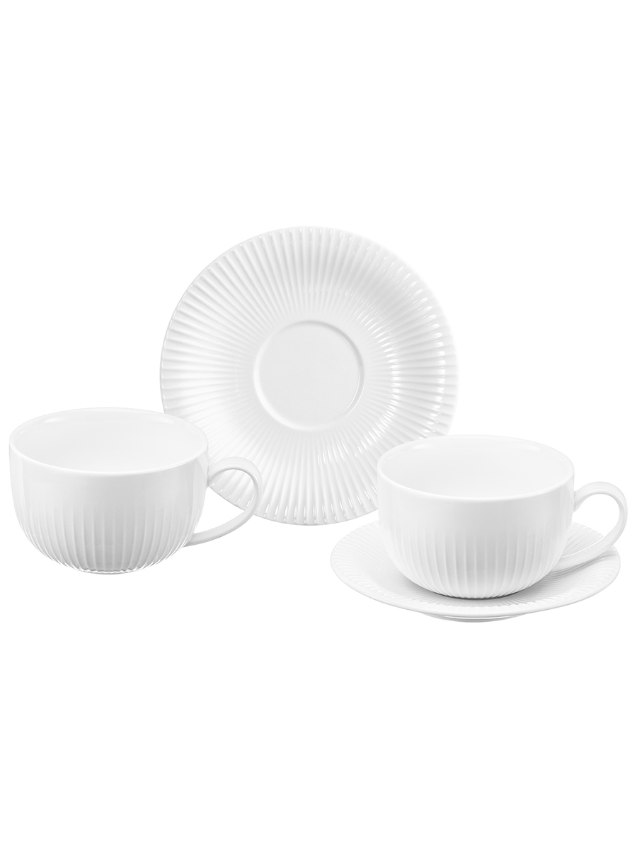 Набор 2 чайных пар Elan Gallery "Соната" выполнен из белого фарфора. Объём каждой чашки – 380 мл, размер – 14х11х7 см. Размер каждого блюдца – 16х16х2 см. Коллекция посуды "Соната" – это воплощение элегантности в фарфоровых формах. Лаконичный рельеф из тонких линий создаёт изысканную игру света на белом фарфоре. Словно классическая музыка, эта коллекция дарит атмосферу утончённости и благородства. Чашки с блюдцами для десерта украсят ваш стол своим эстетичным дизайном как на праздник, так и в будни. Используйте блюдце как подставку для чашки, чтобы порадовать гостей изящной сервировкой. Положите на десертную тарелку кусочек торта, домашнего пирога или пирожное. Небольшая тарелочка подойдёт не только для десерта, но и закусок: сырной нарезки, сырокопчёной колбасы или свежих овощей и зелени. В отличие от керамики фарфор не впитывает цвет напитков, легко отмывается, поэтому сохраняет свою белизну долгое время. Беречь от резких перепадов температур и механических повреждений. Не рекомендуется применять абразивные моющие средства. Комплект можно использовать в микроволновой печи и посудомоечной машине. Поставляется в красивой картонной коробке, поэтому вам не понадобится дополнительная подарочная упаковка, если вы решите преподнести сюрприз. Изящный набор на 2 персоны станет приятным подарком на любой праздник и добавит эстетики каждому чаепитию. В коллекции бренда Элан Галерея представлено много стильных товаров для дома, в том числе всё для создания красоты и уюта на кухне. Коллекция "Соната" от Elan Gallery придаст элегантности повседневной сервировке и станет украшением праздничного стола!