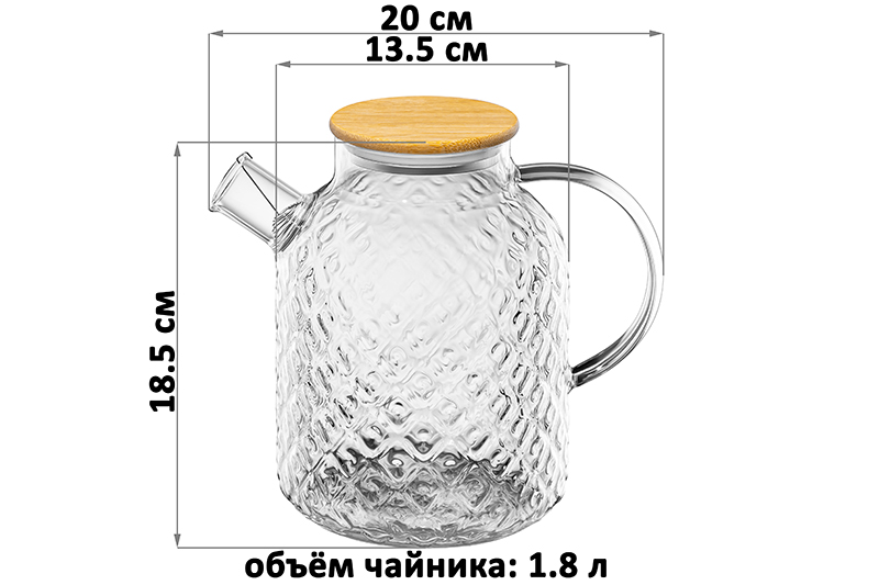 Чайник с бамбуковой крышкой от бренда Elan Gallery из серии Crystal glass объемом 1,8 литра выполнен из прозрачного боросиликатного стекла. Размер – 20х13,5х18,5 см. В носике имеет сито в виде пружинки из металла. Ситечко предотвращает попадание в кружку чаинок и легко вынимается. Чайник выдерживает температуру от -20 до 150 градусов. Легкое, но прочное стекло не темнеет со временем и устойчиво к появлению царапин. Крышка выполнена из бамбука, имеет силиконовый уплотнитель, металлическое дно и защищает от проливаний и потери тепла. Плотно прилегающая крышечка и рельефный узор на стенках в виде ромбиков – детали, благодаря которым этот чайник эстетично выглядит и функционален в использовании. Ручка чайника не нагревается. Бамбук и стекло – экологичные материалы, поэтому такая посуда понравится не только тем, для кого важен стиль, но тем, кто стремится к экологичному образу жизни. При использовании чайника избегайте резких перепадов температур. Нельзя использовать для разогрева жидкостей на плите, на открытом огне, в духовом шкафу. Без крышки можно использовать в микроволновой печи и посудомоечной машине. Бамбук нельзя замачивать! Не мыть абразивными средствами. Поставляется в картонной упаковке. Чайник станет удобным дополнением вашей кухни или приятным подарком на любой праздник!