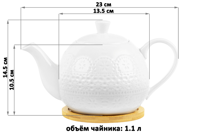 Чайник серии "Кружево " объемом 900 мл на бамбуковой подставке поможет провести множество уютных чаепитий. Чайник выполнен из высококачественного фарфора и украшен рельефными узорами. В носике имеет фильтрующие отверстия против чаинок. На крышке имеется язычок: крышка не будет падать при наклоне. Размер чайника 22,5х13х14 см, размер подставки 12,5х12,5х1 см. Чайник без подставки можно использовать в микроволновой печи и посудомоечной машине. Не замачивайте бамбуковую подставку. Поставляется в стильной картонной упаковке. Чайник из серии посуды "Кружево" сможет стать настоящим украшением вашей кухни или приятным подарком для ваших родных и близких!