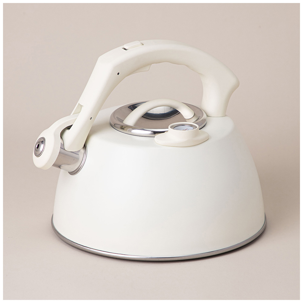 Чайник 3л нерж со свистком, серия Тюдор", индукция, белыйКапсульное термоаккумулирующее дно с прослойкой из алюминия позволяет воде в чайнике дольше оставаться горячей. Благодаря высокой теплопроводности алюминия термоаккумулирующее дно имеет свойства накапливать (аккумулировать) тепло и быстро и равномерно распределять его по всей поверхности посуды.В чайниках с термоаккумулирующим дном вода закипает быстрее, и дольше остается горячей.Встроенный свисток подскажет, что вода в чайнике закипела и его пора снимать с плиты.Подходит для всех типов плит, включая индукционные.Объем - 3 л.Заключаем договора по 44 ФЗ, 223 ФЗ