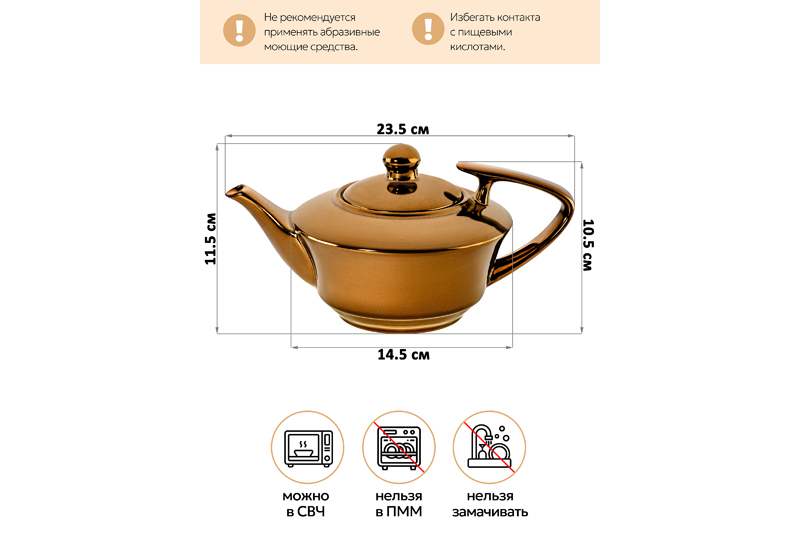 Чайник из серии «Бронза» станет стильным дополнением вашей кухни. Выполнен из фарфора. Размер изделия – 23,5х14,5х11,5 см, объём – 650 мл. Необычная геометрическая форма и бронзовый оттенок придают посуде лимитированной серии Bronze Fusion Porcelain Collection элегантный вид. Спокойный и гармоничный дизайн сочетает в себе прочность бронзы и изысканность фарфора. Фарфоровый чайник подходит для ежедневного заваривания чая и станет незаменимым предметом для организации любого чаепития. Насладитесь ароматным чаем и удивите гостей красивой сервировкой как в будни, так и на праздник. Чайник подойдёт для любых горячих напитков. Благодаря фильтру в виде маленьких отверстий в стеночке вы можете наслаждаться ароматной заваркой без попадания мелких чаинок. С обратной стороны фарфоровой крышки имеется небольшой выступ, поэтому она будет хорошо держаться на чайнике. Нельзя использовать в посудомоечной машине, нельзя замачивать. Поставляется в стильной картонной упаковке. Чайник станет настоящим украшением вашего дома и чудесным подарком для любой хозяйки. Посуда лимитированной серии Bronze Fusion Porcelain Collection украсит кухонный интерьер и будет прекрасно сочетаться между собой!