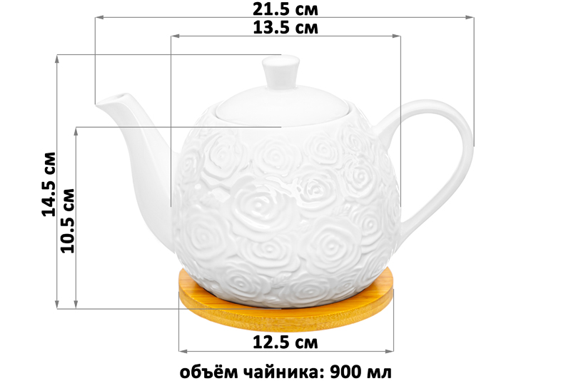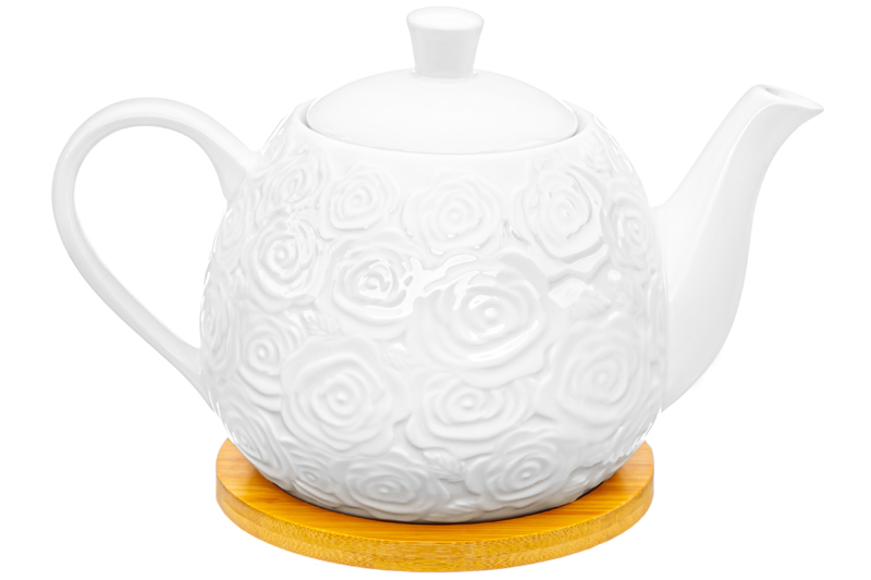 Чайник из серии «Розы» от Elan Gallery предназначен для эстетичной сервировки вашего стола. Размер ёмкости – 21,5х13,5х14,5 см, объём – 900 мл. Размер подставки – 12,5х12,5х1 см. Выполнен из высококачественного белого фарфора. Он не впитывает цвет напитков и легко отмывается, благодаря чему надолго сохраняет свою белизну. Поверхность изделия украшают рельефные узоры в виде пышных бутонов роз. Подставка выполнена из натурального бамбука. Декоративный чайничек подходит для ежедневного заваривания и станет незаменимой составляющей любого чаепития. Фильтр в виде маленький отверстий в стенке позволит наслаждаться ароматной заваркой без попадания мелких чаинок. Крышка прочно держится на заварнике благодаря язычку. Деревянная подставка не только послужит стильным акцентом, но и защитит поверхности от воздействия высоких температур. Вместительный заварочник позволит наполнить множество кружек за раз, практично дополняя больше застолье! Подайте его к столу, чтобы насладиться чаем с конфетами, шоколадом и другими сладостями. Он привнесёт эстетику в организацию чайной церемонии. Лаконичный дизайн впишет чайник в интерьер любой кухни, столовой или гостиной. Не рекомендуется применять абразивные моющие средства. Без подставки подходит для использования в посудомоечной машине. Бамбук нельзя замачивать! Поставляется в дизайнерской картонной коробке – благодаря ей вам не потребуется дополнительная подарочная упаковка. Фарфоровая сервировочная посуда будет оригинальным подарком для хозяйки, ценящей не только практичность, но и привлекательность. Серия «Розы» от бренда Элан Галерея станет украшением любого кухонного инвентаря и позволит собрать красивый сервиз в едином стиле!