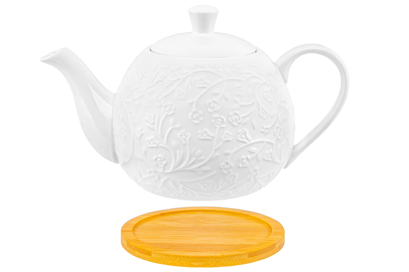 Чайник из серии «Веточки-цветочки» на деревянной подставке предназначен для эстетичной сервировки вашего стола. Размер изделия – 22,5х13х14 см, объём – 900 мл. Размер подставки – 12,5х12,5х1 см. Выполнен из высококачественного белого фарфора. Он не впитывает цвет напитков и легко отмывается, а потому надолго сохранит свою белизну. Подставка выполнена из высококачественного бамбука. Поверхность изделия украшают рельефные узоры в виде лиственных и цветочных веточек. Декоративный чайничек подходит для ежедневного заваривания и станет незаменимым элементом организации любого чаепития. Насладитесь любимым напитком и удивите гостей красивой сервировкой! Фильтр в виде маленьких отверстий в стеночке позволит наслаждаться ароматной заваркой без попадания мелких чаинок. С обратной стороны крышечки имеется язычок, благодаря которому она хорошо держится на заварнике. Вместительный заварочник позволит наполнить множество кружек за раз и станет незаменимым дополнением большого застолья! Подайте его к столу, чтобы насладиться чаем с конфетами, шоколадом и другими сладостями. Станет эстетичной принадлежностью для любой чайной церемонии. Бамбуковая подставка не только послужит выразительным акцентом, но и защитит поверхность от воздействия высоких температур. Благодаря лаконичному дизайну чайник впишется в интерьер любой кухни или столовой. Не рекомендуется применять абразивные моющие средства. Без бамбуковой подставки подходит для использования в посудомоечной машине. Бамбук нельзя замачивать! Поставляется в дизайнерской картонной коробке – благодаря ей вам не потребуется дополнительная подарочная упаковка. Фарфоровая посуда станет стильным подарком для хозяйки, ценящей не только практичность, но и привлекательность. Серия «Веточки-цветочки» станет украшением любого кухонного инвентаря и позволит собрать сервиз в едином стиле!