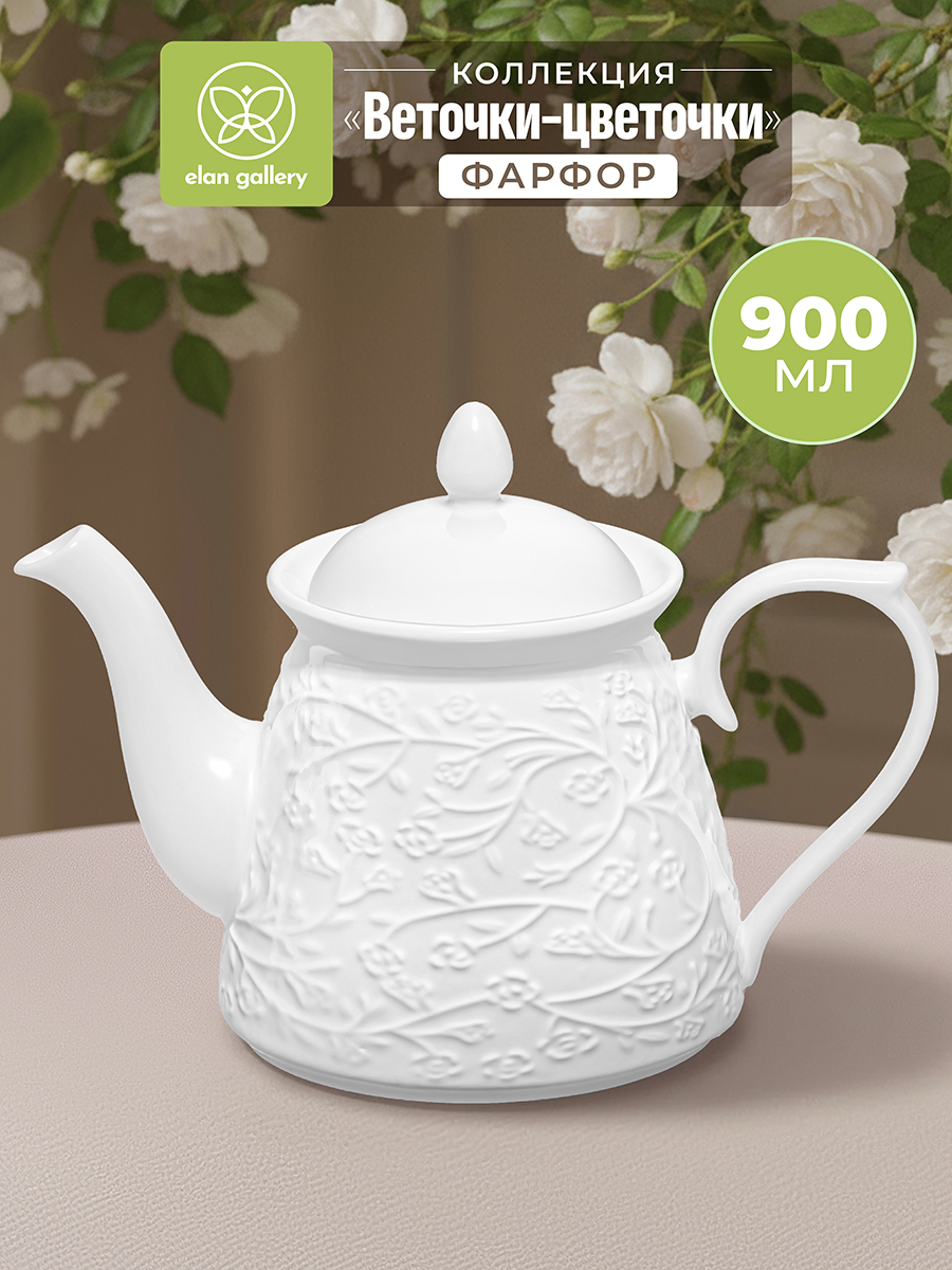 Заварочный чайник Elan Gallery "Веточки-цветочки" размером 23х13х16,5 см и объёмом 900 мл выполнен из белого фарфора. Высота без крышки – 12 см, диаметр крышки – 8,2 см. Фарфоровый чайничек подходит для ежедневного заваривания чая и станет незаменимым предметом для праздничного чаепития. Вы сможете насладиться ароматным чаем и удивить гостей красивой сервировкой стола как в будни, так и на праздник. Чайник подойдёт для любых горячих напитков и удобен в использовании. Он оснащен фильтром в виде маленьких отверстий в стеночке, благодаря которому вы сможете наслаждаться ароматной заваркой без попадания мелких чаинок. На фарфоровой крышке с обратной стороны есть язычок, чтобы она хорошо держалась. Фарфоровое изделие станет украшением кухни и незаменимым помощником для организации чайных церемоний. Порадуйте гостей ароматным напитком и десертом с заварным кремом! Не рекомендуется применять абразивные моющие средства. Беречь от резких перепадов температур и механических повреждений. Можно использовать в посудомоечной машине и микроволновой печи. Поставляется в стильной картонной коробке. Вам не придётся искать дополнительную подарочную упаковку, чтобы сделать сюрприз близким на праздник. Праздничная посуда – хороший вариант для подарка. Красивый дизайн и функциональность подарочного чайника понравятся каждому, а высокое качество фарфора обеспечит его долговечность. В коллекции бренда Элан Галерея можно найти много красивого кухонного и столового инвентаря, а также собрать чайный набор на свой вкус. Коллекция "Веточки-цветочки" от Elan Gallery наполнит повседневные моменты лёгкостью и сказочной атмосферой, а также позволит создать красивую сервировку праздничного стола!