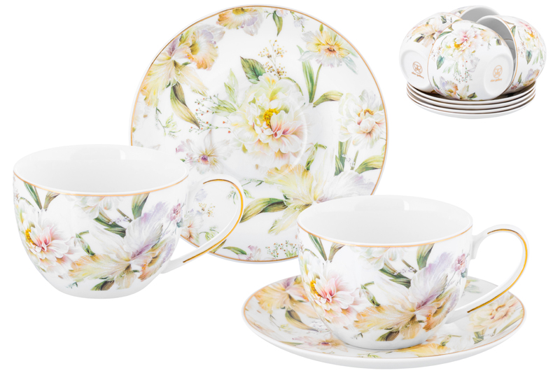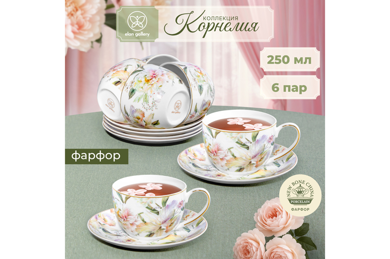 Набор 6 чайных пар из серии «Корнелия» от Elan Gallery предназначен для эстетичной сервировки вашего стола. Размер каждой ёмкости – 12,5х9х6,5 см, объём – 250 мл. Размер каждого блюдца – 15,3х15,3х2 см. Изготовлены из фарфора нового поколения new bone china, сочетающего в себе изящность и высокую прочность. За счёт гладкости изделия легко отмываются, поэтому сохраняют привлекательный внешний вид и практичны в использовании. Плотная структура материала позволяет посуде дольше сохранять температуру блюд и напитков. От других видов костяного фарфора new bone china отличается большей экологичностью в производстве. Поверхность изделий овивают изображения обворожительных белых пионов. Они выполнены в манере, вдохновлённой акварельным рисунком. Тонкая золотистая окантовка служит деликатным акцентом и подчёркивает их изысканность. Кофейные кружечки помогут провести множество приятных завтраков с капучино и латте, а также уютные чайные вечера с конфетами, вафлями, другими десертами и сладостями. Подойдут ценителям чая и кофе, которые любят пить из красивой и необычной посуды. Согрейтесь зимой любимым напитком: какао с маршмэллоу, ягодным чаем или горячим шоколадом. Летом освежитесь домашним лимонадом или морсом. Используйте сервировочные блюдца как подставки для чашек или заполните пирожными, кусочками торта и домашнего пирога. Подойдут для закусок: сырной нарезки, сырокопчёной колбасы или свежих овощей и зелени. Декоративный комплект позволит организовать запоминающееся чаепитие в большой компании. Не рекомендуется применять абразивные моющие средства. Не подходят для использования в посудомоечной машине и микроволновой печи. Поставляются в подарочной упаковке. Фарфоровая сервировочная посуда будет оригинальным подарком для хозяйки, ценящей не только практичность, но и привлекательность. Серия «Корнелия» от бренда Элан Галерея добавит вашему кухонному инвентарю лёгкости и элегантности, преобразив любую сервировку!