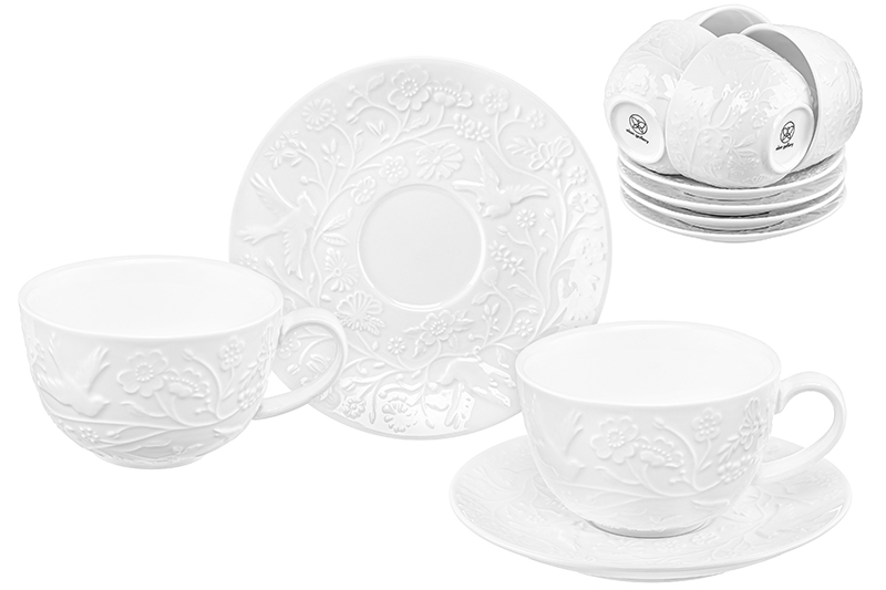 Набор 6 чайных пар от Elan Gallery из серии «Райский сад» предназначен для эстетичной сервировки стола. Размер каждой чашки – 13х10х6,5 см, объём – 300 мл. Размер каждого блюдца – 16х16х1,8 см. Выполнены из высококачественного белого фарфора и украшены изысканным рельефным узором. Поверхность изделий овивают тонкие лиственные и цветочные веточки, возле которых порхают выразительные птицы. Фарфор не впитывает цвет напитков и легко отмывается, благодаря чему надолго сохранит свою белизну. Милые декоративные кружки помогут провести множество чайных и кофейных застолий в большой и приятной компании. Каждая чашечка поможет насладиться неторопливым завтраком с капучино и латте, а также уютными вечерами. Подойдут любителям пить из красивой и необычной посуды. Согрейтесь зимой любимым напитком: какао с маршмэллоу, ягодным чаем, горячим шоколадом или крепким кофе. Летом освежитесь лимонадом, соком или самодельным морсом. Соберитесь в кругу семьи на тёплое чаепитие с тортом, шоколадом и другими сладостями. Используйте сервировочные блюдца как подставки для чашечек, чтобы порадовать гостей изящной сервировкой. Задействуйте в качестве десертных – положите на них пирожные или кусочки домашнего пирога. Небольшие тарелочки подойдут не только для десертов, но и для закусок: сырной нарезки, сырокопчёной колбасы, свежих овощей и зелени. Благодаря лаконичному дизайну набор впишется в интерьер любой кухни или столовой. Не рекомендуется применять абразивные моющие средства. Подойдут для использования в посудомоечной машине и микроволновой печи. Набор поставляется в дизайнерской картонной упаковке. Фарфоровая сервировочная посуда станет оригинальным подарком для хозяйки, ценящей не только практичность, но и привлекательность. Серия «Райский сад» станет украшением любого кухонного инвентаря и позволит собрать сервиз в едином стиле!