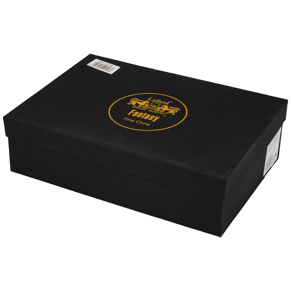 Коллекция "Fantasy" ТМ LEFARD - это модная сервировка стола и стильный кухонный интерьер в классическом черном с золотом цвете. Блюда и формы различных размеров, менажницы на бамбуковых подставках, банки, тарелки и салатники различного назначения, чайники, чайные пары и кружки выполнены из упрочненного фарфора. Четкие линии, сверкающее глянцевое покрытие. Вы и Ваш стол неотразим! Посуда прошла сертификацию. Безопасна для контакта с пищевыми продуктами. Можно использовать в микроволновой печи. Не рекомендуется мыть в посудомоечной машине.