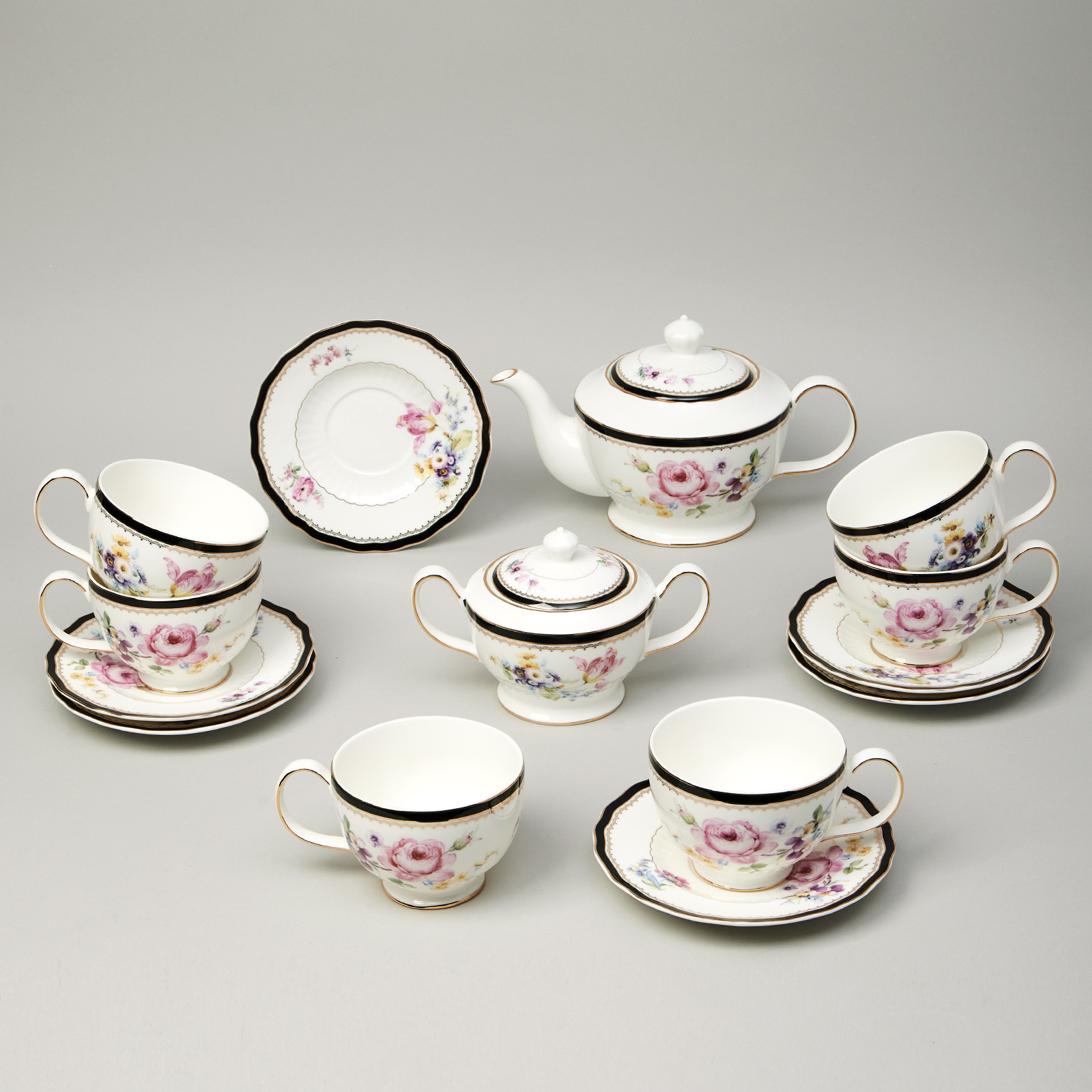 Комплектация: чайник 900 мл - 1 шт., сахарница 350 мл - 1 шт., чашка 260 мл - 6 шт., блюдце 15,5 см - 6 шт.