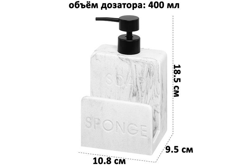 Диспенсер Elan Gallery "Мрамор" объёмом 400 мл и размером 10,8х9,5х18,5 см поможет создать чистоту и уют в вашем доме. Ёмкость выполнена из полирезина, дозатор с трубочкой – из пластика. Полирезин – это современный материал, который славится своей лёгкостью, устойчивостью к влаге и солнечным лучам. Он не выделяет вредных веществ. Высота бутылки без дозатора 14 см. Флакончик украшен надписью "Soap" ("Мыло"). Вместительный объём бутылочки позволит налить в неё достаточно жидкости, чтобы хватило для длительного использования. Для удобства органайзер имеет специальное отделение для губки, украшенное надписью "Sponge" ("Губка"). Губка в комплекте не поставляется. Стильный диспенсер с отсеком подойдёт для использования на кухне или в ванной комнате. Налейте в него моющее средство, гель для мытья посуды или жидкое мыло. Эргономичная форма позволяет разместить флакон с дозатором на раковине или полке. Универсальную бутылочку можно приспособить под антисептик. Просто поставьте её на стол, чтобы средство для дезинфекции было всегда под рукой. Ёмкость выполнена в стильном дизайне, имитирующим мраморное покрытие, поэтому украсит домашний интерьер. Не рекомендуется применять абразивные чистящие средства. Поставляется в стильной картонной коробке. Благодаря красочной коробочке не понадобится подарочная упаковка, если вы решите сделать подарок своим близким на праздник. Настольный диспенсер — это не только практичное, но и стильное решение для организации чистоты и порядка в вашем доме. В коллекции бренда Элан Галерея представлено много стильных товаров для дома. Выберите вариант на свой вкус!