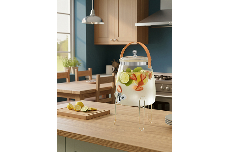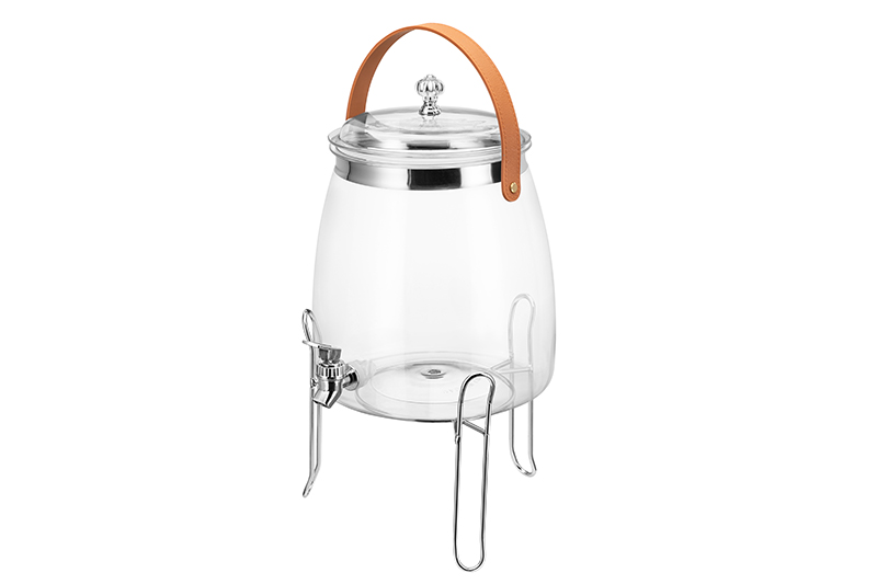 Диспенсер от Elan Gallery предназначен для эстетичной подачи холодных напитков. Размер ёмкости – 27х23х30 см, объём – 8 литров. Выполнен из пластика. Герметичная крышка с удобной ручкой оснащена силиконовым уплотнителем. Поставляется в комплекте с металлической подставкой размером 27х27х19 см. Она позволит удобно расположить изделия на столе и обеспечит удобство в использовании. Пластиковый кран диаметром 1,5 см поможет вам разлить напитки в нужном объёме. Используйте изделие для питьевой воды в качестве настольного кулера. Для красивой сервировки добавьте в прозрачный контейнер нарезанные фрукты, украсив безалкогольные и алкогольные коктейли. Благодаря большому объёму бочонок подойдёт для розлива вина, пива и других напитков на празднике. Ёмкость имеет лёгкий вес, а прочная полукруглая ручка обеспечивает комфортную переноску. Это идеальный вариант не только для обеда на веранде, но и для пикника в большой компании. На даче сосуд удобно использовать под компот из ягод – он вместит больше жидкости, чем стандартный кувшин или графин. Не рекомендуется применять абразивные моющие средства. Поставляется в прочной картонной упаковке. Красивая посуда, кухонный инвентарь и товары для дома от бренда Элан Галерея позволят создать уют на вашей кухне или в столовой!