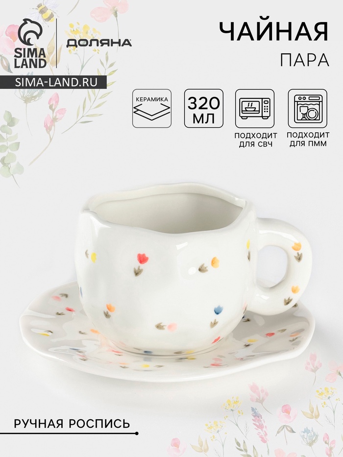 Погрузитесь в атмосферу утренней свежести с этой изысканной чайной парой, которая станет идеальным спутником для вашего чаепития. Чашка объёмом 320 мл и блюдце диаметром 16 см, выполненные из белоснежной керамики, украшены ручной росписью в цветочно-растительной тематике, что придаёт набору особый шарм и элегантность.