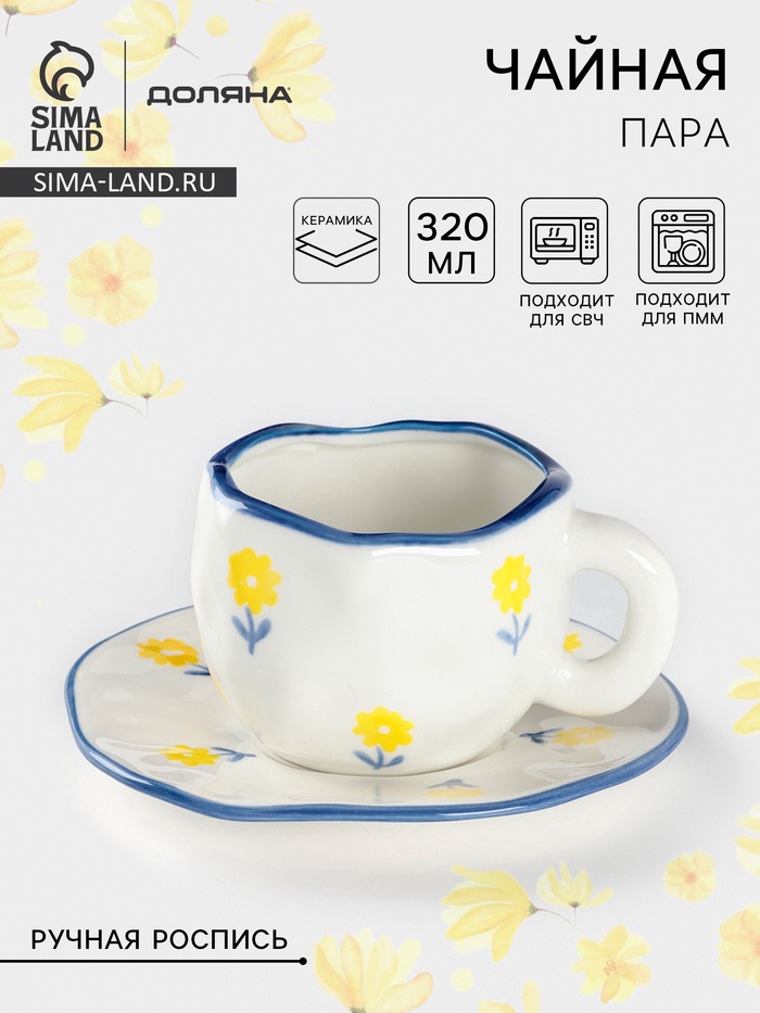 Откройте для себя истинное наслаждение чаепитием с этой уютной чайной парой, которая привнесёт в ваши будни нотку изящества и природной красоты. Каждая деталь, от чашки до блюдца, выполнена вручную и украшена изысканным цветочным рисунком, воплощающим нежность одуванчиков, что делает этот набор уникальным и неповторимым.