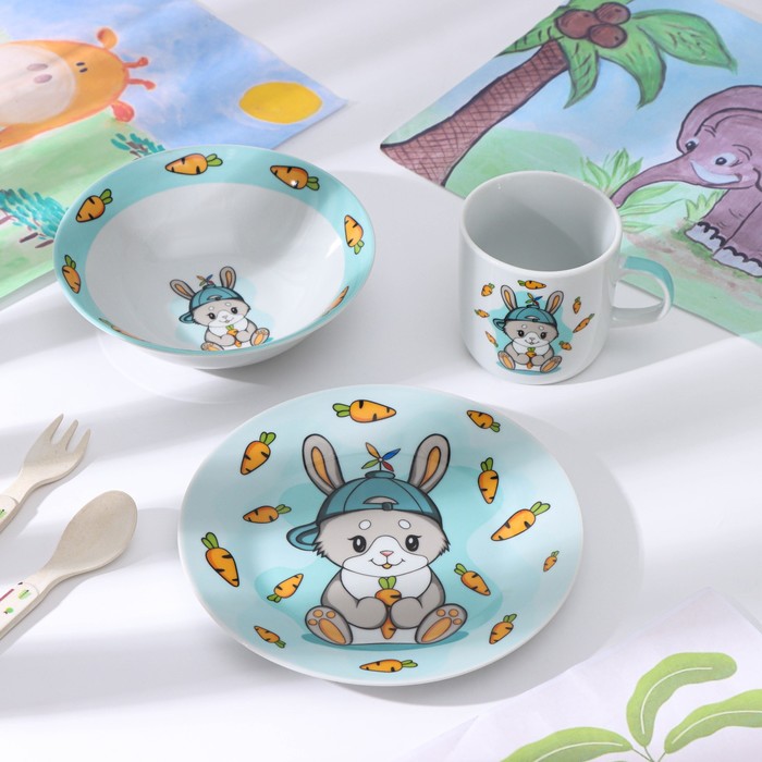 Набор детской посуды из керамики Доляна «Милый зайка», 3 предмета: кружка 230 мл, миска 400 мл, тарелка d=18 см, белый