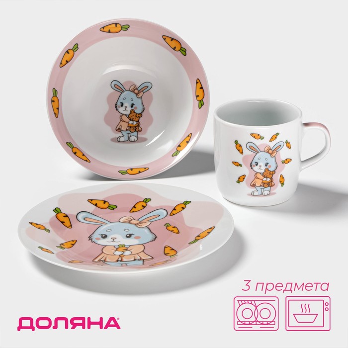 Набор детской посуды Доляна «Лапочка зайка», 3 предмета: кружка 230 мл, миска 400 мл, тарелка d=18 см, керамика, белый