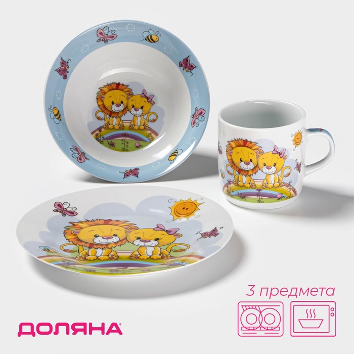 Набор детской посуды Доляна «Львята», 3 предмета: кружка 230 мл, миска 400 мл, тарелка d=18 см, цвет белый