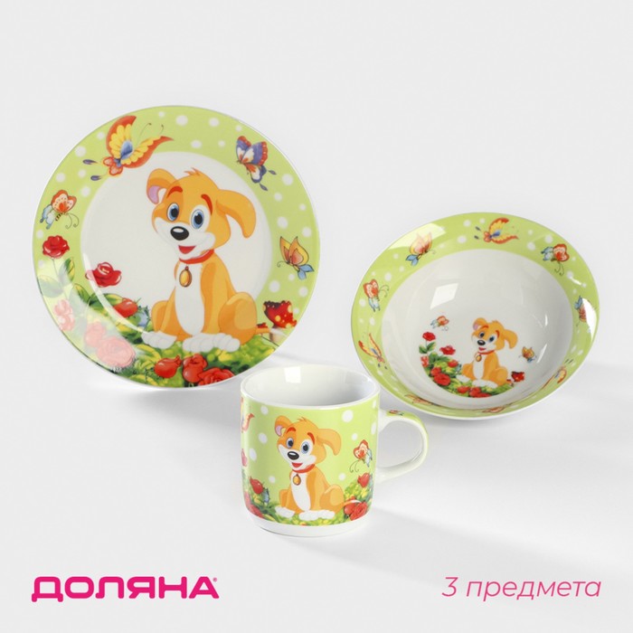 Набор детской посуды Доляна «Щенок», 3 предмета: кружка 230 мл, миска 400 мл, тарелка d=18 см, керамика, белый, зелёный