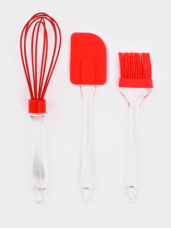 В набор для выпечки входит шпатель, кисточка и венчик. Приборы изготовлены из прочного материала, не выделяют запахов и вредных веществ, безопасны в использовании.