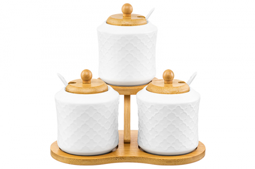 БЫЛО 1553 руб!! Набор 3 банок д/хранения 380 мл 21,5*9,5*28,5 см "Витраж" + бамб. крышк + ложки., на бамб.подставке