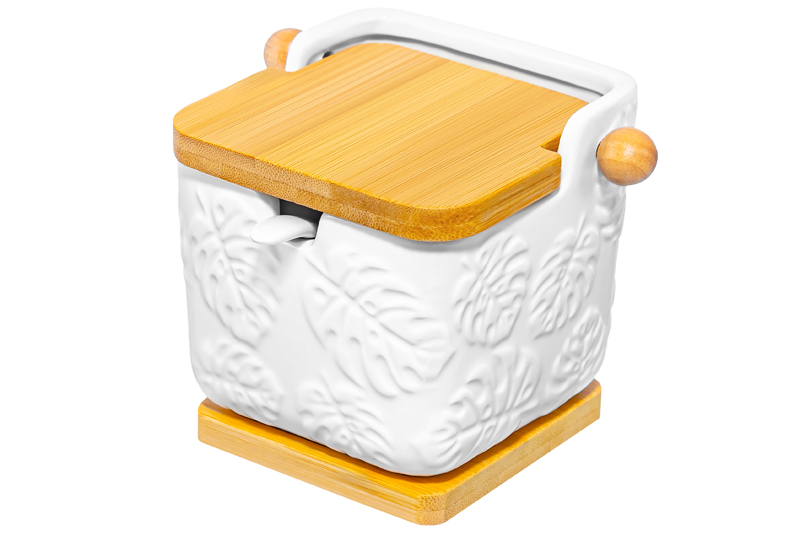 БЫЛО 607 руб! Банка д/сыпучих продуктов 300 мл 12*9*9,5 см "Тропики"+ложка+откид.бамб.крыш.+дер.подст