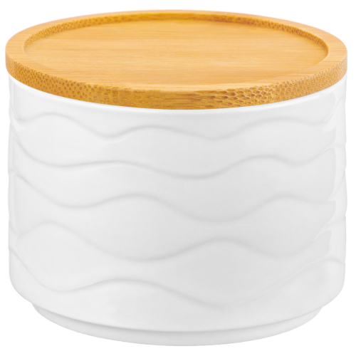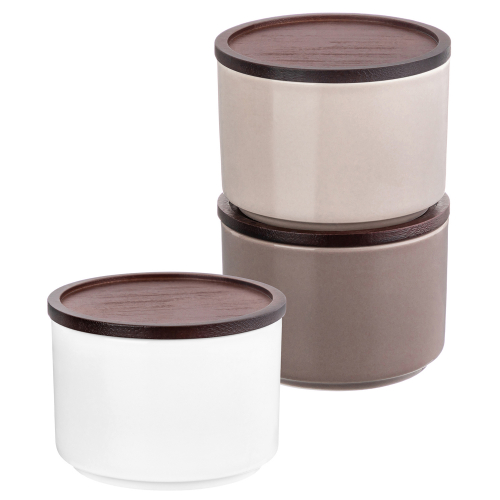 БЫЛО 944 руб! Набор 3 банок д/хранения 250 мл 9,3*9,3*7 см "Гладь"+дер.крыш-подст. с сил/упл. (белая, бежев, коф.)