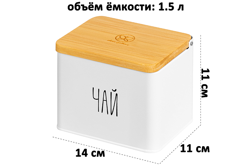 Ёмкость с откидной бамбуковой крышкой от Elan Gallery создана для эстетичного хранения сыпучих продуктов на вашей кухне. Размер – 14х11х11 см, объём – 1,5 литра. Крышечка украшена фирменным логотипом бренда. Прямоугольная баночка белого цвета выполнена из металла, откидная крышка из бамбука прочно закреплена на банке (не снимается). Контейнер украшен большой надписью «Чай». Теперь любимый напиток всегда будет под рукой! Благодаря крупной надписи на ёмкости вы без труда определите её содержимое. Бамбуковая крышка не впитывает запахи и защитит продукты от пыли и влаги. Благодаря лаконичному дизайну квадратная баночка впишется в любой интерьер кухни или столовой. Не рекомендуется применять абразивные моющие средства. Нельзя использовать в посудомоечной машине и микроволновой печи. Нельзя замачивать. Кухонный инвентарь поставляется в стильной картонной коробке. Благодаря красочной коробочке вам не понадобится дополнительная подарочная упаковка, если заходите сделать сюрприз своим близким на любой праздник. Станет полезным подарком, потому что всегда пригодится в быту. В нашем ассортименте представлено много функциональных товаров для дома и красивой посуды. Выберите варианты на свой вкус и соберите целую коллекцию кухонных принадлежностей от бренда Элан Галерея!