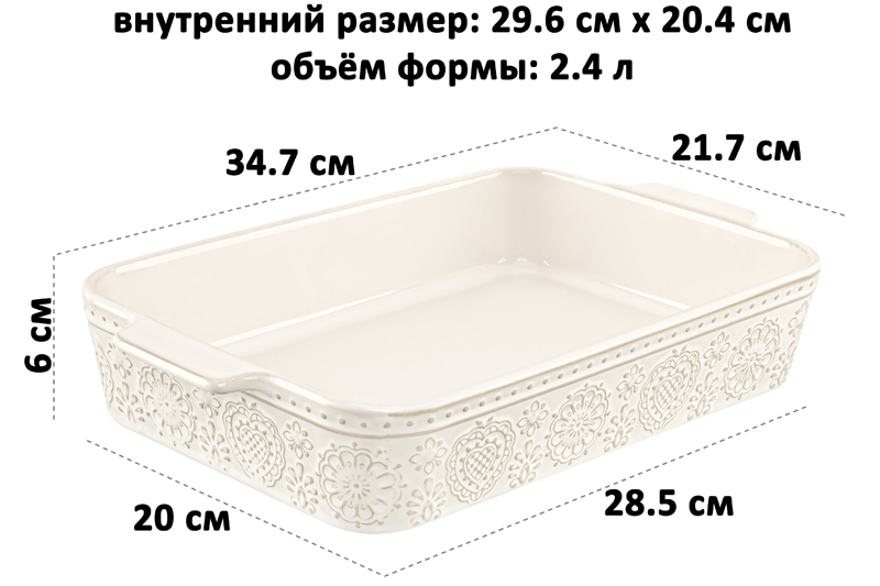 Форма для запекания Elan Gallery "Традиция" объемом 2,4 литра выполнена из фарфора. Размер 34,7×21,7×6 см. Внутренний размер 29,6х20,4х5,5 см. Размер изделия без ручек 30,5х21,7х6 см, размер дна 28,5х20 см. Фарфоровая ёмкость молочного белого цвета подходит для выпекания в духовке и подачи готового блюда на стол в той же форме. В ней получится чудесная лазанья или выпечка. "Традиция" – это коллекция посуды для запекания, вдохновлённая уютом домашней кухни. Мягкие очертания, нежные оттенки и рельефные узоры навевают атмосферу безмятежности и пробуждают светлые воспоминания. Изделия созданы для любимых блюд по семейным рецептам, которые собирают близких за одним столом. Глубокая тарелка прямоугольной формы удобна для приготовления различных кулинарных шедевров: мясных и овощных запеканок, а также пирога и заливного. Блюдо станет универсальным предметом на кухне: можно использовать для приготовления и сервировки еды. Испеките нежный десерт из творога, а также приготовьте чизкейк, кекс или бисквит. Любители кондитерских изделий оценят удобство при создании творожной выпечки или тирамису. Используйте как контейнер для хранения остатков еды, прикрыв фольгой, либо в роли сервировочного лотка для подачи закусок, хлеба и горячих блюд из мяса и рыбы. Можно использовать как шубницу – для приготовления классической селёдки под шубой или подачи салата. Инструкция: не рекомендуется применять абразивные моющие средства. Избегать резких перепадов температур и механических повреждений. Можно использовать в микроволновой печи, посудомоечной машине и духовом шкафу при температуре до 230 градусов. Запрещено использовать на плите и открытом огне. Кухонный инвентарь станет полезным подарком на праздник. Поставляется в стильной картонной коробке. Благодаря красочной коробочке не понадобится подарочная упаковка, если вы решите сделать сюрприз. В коллекции бренда Элан Галерея представлено много кухонной утвари и других товаров для дома. Выберите вариант на свой вкус!
