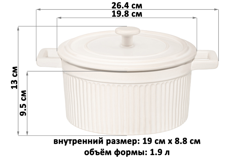 Форма для запекания с крышкой и ручками Elan Gallery "Традиция" объемом 1,9 литра выполнена из фарфора. Размер 26,4×19,8×13 см. Внутренний размер 19х8,8 см. Высота без крышки 9,5 см, диаметр крышки 20,6 см, диаметр дна 17,7 см. Фарфоровая ёмкость молочного белого цвета подходит для выпекания в духовке и подачи готового блюда на стол в той же форме. "Традиция" – это коллекция посуды для запекания, вдохновлённая уютом домашней кухни. Мягкие очертания, нежные оттенки и рельефные узоры навевают атмосферу безмятежности и пробуждают светлые воспоминания. Изделия созданы для любимых блюд по семейным рецептам, которые собирают близких за одним столом. Фарфоровая ёмкость предназначена для запекания в духовке блюд из мяса, рыбы, овощей и грибов. Приготовьте в ней жаркое, рагу или картофель со сметаной и зеленью. Горшочек привлекательно выглядит, поэтому вы можете подавать еду на стол прямо в нём. Подойдёт для красивой подачи на стол и хранения в холодильнике супов и домашних пельменей. Используйте как супницу или пельменницу для сервировки праздничного стола, чтобы угостить большое количество гостей. Инструкция: запрещено использовать на плите и открытом огне. Не рекомендуется применять абразивные моющие средства. Избегать резких перепадов температур и механических повреждений. Можно использовать в микроволновой печи, посудомоечной машине и духовом шкафу при температуре до 230 градусов. Кухонный инвентарь станет полезным подарком на праздник. Круглый жаропрочный горшок поставляется в стильной картонной коробке. Благодаря красочной коробочке не понадобится подарочная упаковка, если вы решите сделать сюрприз. В коллекции бренда Элан Галерея представлено много кухонной утвари и других товаров для дома. Выберите вариант на свой вкус!