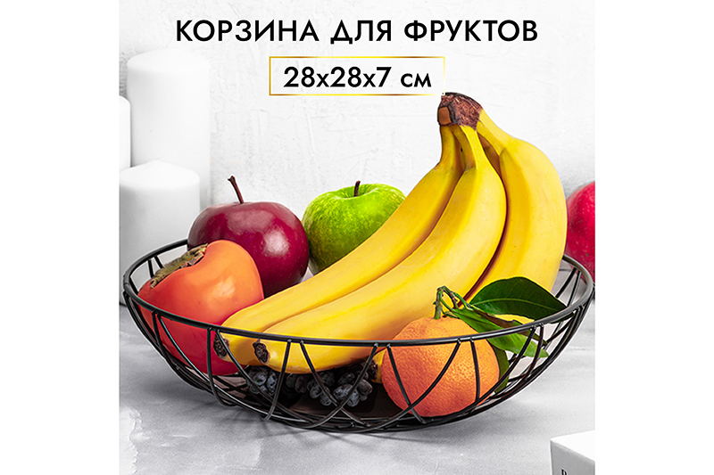 Фруктовница размером 28,5х28,5х7,5 см выполнена из металла и имеет оригинальный дизайн. Металлическое блюдо – это универсальное решение для интерьера вашего дома или офиса. Можно разместить в вазе фрукты на кухне, а также украсить корзинкой гостиную или приёмную. Корзина эстетично впишется в самые разные стили интерьера: лофт, сканди и минимализм. Удобный кухонный аксессуар для сервировки овощей и фруктов поможет организовать порядок на вашей кухне. Сервировочная фруктовая подставка не только дополнит декор праздничного стола, но и подойдет для пикника. Такая стильная посуда порадует ваших гостей и сделает застолье еще приятнее! Не рекомендуется применять абразивные моющие средства. Нельзя использовать в микроволновой печи и посудомоечной машине. Настольная корзина станет отличным подарком для женщин на любой праздник. Подарите её маме, бабушке или сестре – такой вещи будет рада каждая хозяйка. Стильная корзина для фруктов станет украшением вашей кухни или приятным подарком для родных и близких!