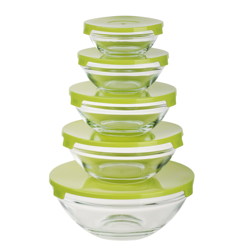 Набор салатников с крышкой 5шт: 900/ 500/350/200/130мл, стекло, пластик, оливковый