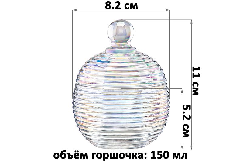 Горшочек для мёда Elan Gallery "Каскад" с крышкой выполнен из стекла и украшен декоративным рельефным узором в виде горизонтальных полосок. Размер изделия – 8,2х8,2х11 см, объём – 150 мл. Высота без крышки – 5,2 см. Прозрачная баночка с полосатым рельефом и перламутровым сиянием подойдёт для хранения мёда, варенья, сахара и соли. Можно использовать её как ёмкость для чая, кофе и других сыпучих продуктов. Декоративная баночка круглой формы станет гармоничным дополнением при сервировке вашего стола как в будни, так и на праздник. Красивый дизайн позволит использовать её не только для хранения продуктов, но и для подачи на стол. Положите в неё конфеты или икру, чтобы удивить гостей изящной сервировкой. Стеклянную ёмкость с крышечкой можно использовать не только как сахарницу, икорницу или соусник, но и для специй и приправ. Это позволит держать под рукой всё необходимое во время приготовления и приёма пищи. На даче медовница будет незаменимой для семейного чаепития, а также подойдёт для подачи ягод. В качестве альтернативы красивую вазочку с крышкой можно использовать как шкатулку или органайзер. Сложите в неё украшения и любые маленькие предметы. Подходит в роли стакана для свечи. Не рекомендуется применять абразивные моющие средства. Нельзя использовать в микроволновой печи и посудомоечной машине. Поставляется в стильной картонной упаковке. Красивая посуда – это отличный подарок на любой праздник. Медовый бочонок "Каскад" станет многофункциональным дополнением вашего кухонного инвентаря и украсит домашний интерьер!