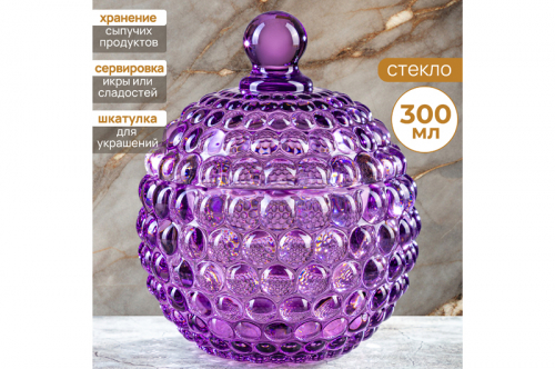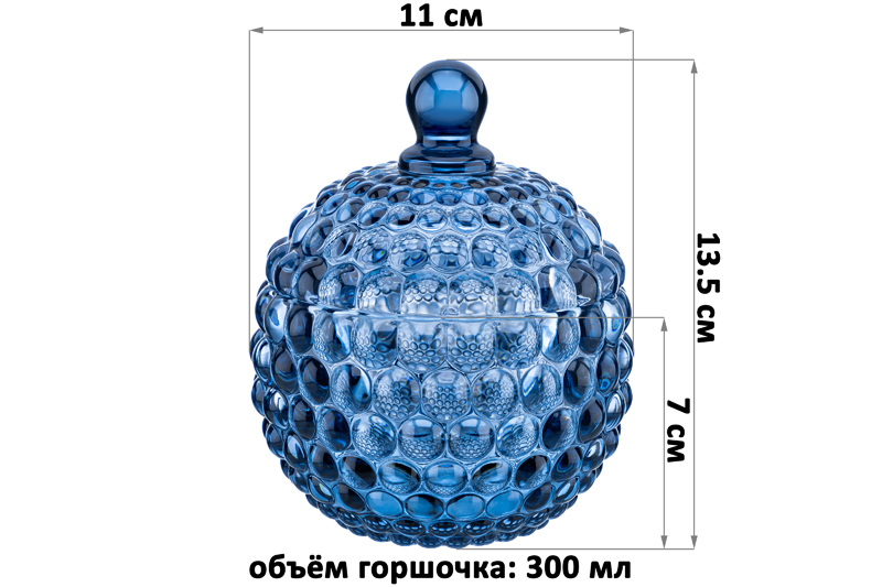 Горшочек для мёда “Пузырьки” с крышкой выполнен из стекла и украшен декоративным рельефным узором. Размер изделия – 11х11х13,5 см, объём – 300 мл. Высота без крышки – 7 см. Интересная баночка синего цвета подойдёт для хранения мёда, варенья, сахара и соли. Можно использовать её как ёмкость для чая, кофе и других сыпучих продуктов. Декоративная баночка круглой формы станет гармоничным дополнением при сервировке вашего стола как в будни, так и на праздник. Красивый дизайн позволит использовать её не только для хранения продуктов, но и для подачи на стол. Положите в неё конфеты или икру, чтобы удивить гостей изящной сервировкой. Стеклянную ёмкость с крышечкой можно использовать не только как сахарницу, икорницу или соусник, но и для специй и приправ. Это позволит держать под рукой всё необходимое во время приготовления и приёма пищи. На даче медовница будет незаменимой для семейного чаепития, а также подойдёт для подачи ягод. В качестве альтернативы красивую вазочку с крышкой можно использовать как шкатулку. Сложите в неё украшения и любые маленькие предметы. Не рекомендуется применять абразивные моющие средства. Не использовать в посудомоечной машине и микроволновой печи. Поставляется в стильной картонной упаковке. Красивая посуда – это отличный подарок на любой праздник. Медовый бочонок “Пузырьки” станет многофункциональным дополнением вашего кухонного инвентаря и настоящим украшением кухни!