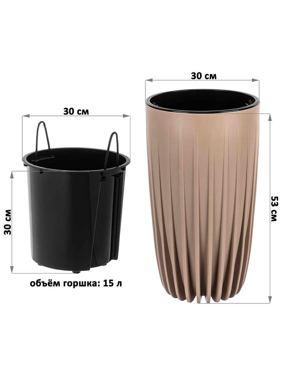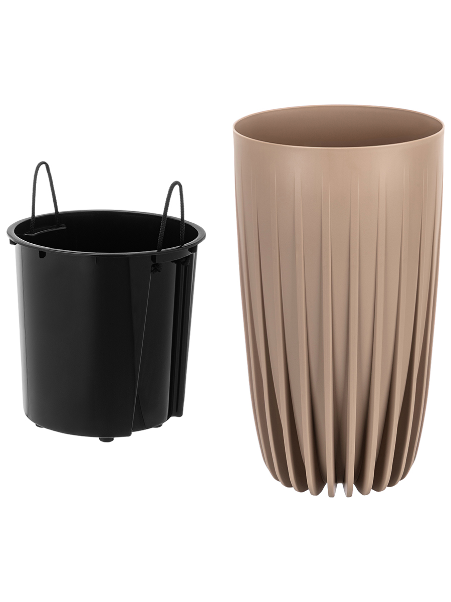 Горшок для цветов от бренда ELCASA — это удобное интерьерное решение для квартиры или дачи. Размер внешней ёмкости 30×30×53 см, объём — 27,3 литра. Размер дна 21х21 см. В комплекте поставляется дренажная вставка (ведро) чёрного цвета размером 29,5х29,5х30 см на 15 литров. Она имеет ручки в виде 2 верёвочек. Высота ножек дренажной вставки 2 см, её внутренний размер 26,5х26,5х28 см. Кашпо можно использовать как напольное или уличное. Изделие выполнено из прочного и экологичного пластика – полипропилена. Материал устойчив к влаге и другим внешним воздействиям, благодаря чему цветочный горшочек можно использовать на улице. Подойдёт для украшения живыми цветами сада, балкона или террасы. Внешняя часть кашпо в оттенке фраппе украшена рельефом. Оригинальный, но при этом универсальный дизайн подходит под любой интерьер. Дренажное ведёрко чёрного цвета в комплекте избавляет комнатные цветы и садовые композиции из живых растений от застоя воды. Цветок в красивом горшке будет отлично смотреться на полу, во дворе или в саду. Создайте уютную зону отдыха в любом помещении, украсив её декоративными растениями. Благодаря универсальному дизайну подойдёт под любой стиль интерьера городской квартиры, а также гармонично впишется в атмосферу загородного участка как уличное кашпо. Не рекомендуется применять абразивные моющие средства. Беречь от механических повреждений. Станет полезным подарком на любой праздник для любителей живых растений и цветоводов. В коллекции бренда ELCASA представлено много функциональных товаров для дома, садоводства и предметов декора. Выберите варианты на свой вкус!