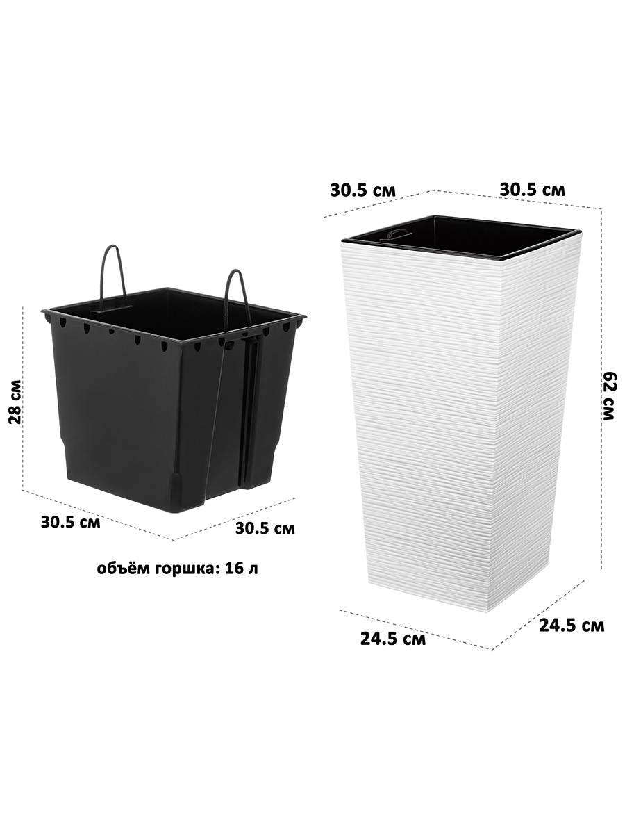 Прямоугольный горшок для цветов 30,5×30,5×62 см от бренда ELCASA — это удобное интерьерное решение для квартиры или дачи. Имеет форму, слегка зауженную книзу. Объём внешней ёмкости 43 литра. Размер её дна 24,5х24,5 см. Имеет внутреннее съёмное ведро чёрного цвета размером 30,5х30,5х28 см на 16 литров. Создано для удобства ухода за растением, дренажных отверстий не имеет. При необходимости их можно проделать. Внутренний размер чёрного ведёрка 28х28х27 см, в комплекте к нему идут 2 ручки в виде верёвочек. Кашпо можно использовать как напольное или уличное. Изделие выполнено из прочного и экологичного пластика – полипропилена. Материал устойчив к влаге и другим внешним воздействиям, благодаря чему цветочный горшочек можно использовать на улице. Подойдёт для украшения живыми цветами сада, балкона или террасы. Внешняя часть кашпо белого цвета украшена рельефом. Оригинальный, но при этом универсальный дизайн подходит под любой интерьер. Цветок в красивом горшке будет отлично смотреться на полу, во дворе или в саду. Создайте уютную зону отдыха в любом помещении, украсив её декоративными растениями. Благодаря универсальному дизайну подойдёт под любой стиль интерьера городской квартиры, а также гармонично впишется в атмосферу загородного участка как уличное кашпо. Не рекомендуется применять абразивные моющие средства. Беречь от механических повреждений. Станет полезным подарком на любой праздник для любителей живых растений и цветоводов. В коллекции бренда ELCASA представлено много функциональных товаров для дома, садоводства и предметов декора. Выберите варианты на свой вкус!