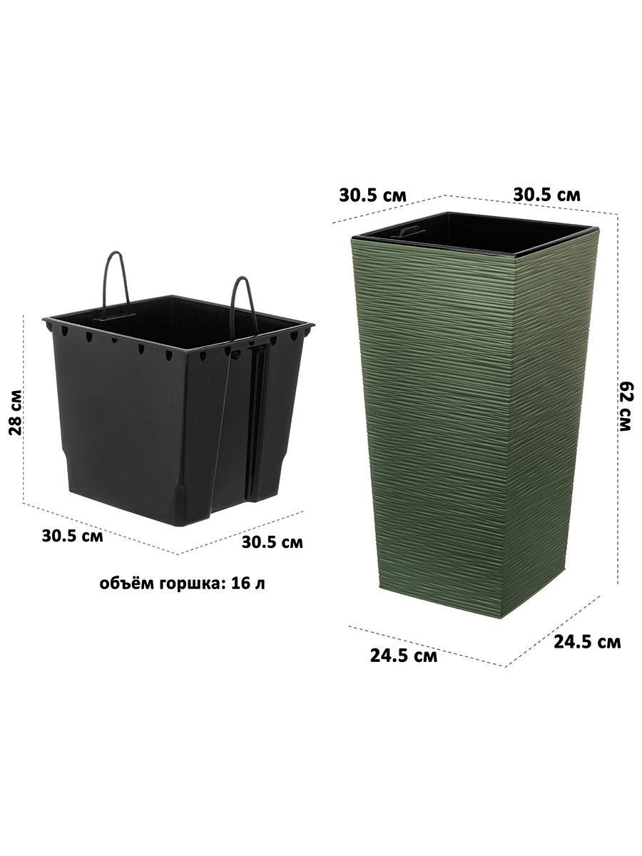 Прямоугольный горшок для цветов 30,5×30,5×62 см от бренда ELCASA — это удобное интерьерное решение для квартиры или дачи. Имеет форму, слегка зауженную книзу. Объём внешней ёмкости 43 литра. Размер её дна 24,5х24,5 см. Имеет внутреннее съёмное ведро чёрного цвета размером 30,5х30,5х28 см на 16 литров. Создано для удобства ухода за растением, дренажных отверстий не имеет. При необходимости их можно проделать. Внутренний размер чёрного ведёрка 28х28х27 см, в комплекте к нему идут 2 ручки в виде верёвочек. Кашпо можно использовать как напольное или уличное. Изделие выполнено из прочного и экологичного пластика – полипропилена. Материал устойчив к влаге и другим внешним воздействиям, благодаря чему цветочный горшочек можно использовать на улице. Подойдёт для украшения живыми цветами сада, балкона или террасы. Внешняя часть кашпо в оттенке нефрит украшена рельефом. Оригинальный, но при этом универсальный дизайн подходит под любой интерьер. Цветок в красивом горшке будет отлично смотреться на полу, во дворе или в саду. Создайте уютную зону отдыха в любом помещении, украсив её декоративными растениями. Благодаря универсальному дизайну подойдёт под любой стиль интерьера городской квартиры, а также гармонично впишется в атмосферу загородного участка как уличное кашпо. Не рекомендуется применять абразивные моющие средства. Беречь от механических повреждений. Станет полезным подарком на любой праздник для любителей живых растений и цветоводов. В коллекции бренда ELCASA представлено много функциональных товаров для дома, садоводства и предметов декора. Выберите варианты на свой вкус!