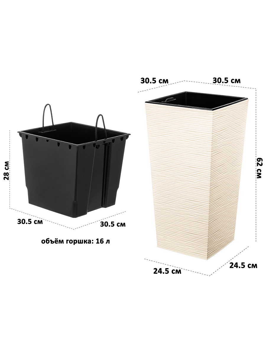 Прямоугольный горшок для цветов 30,5×30,5×62 см от бренда ELCASA — это удобное интерьерное решение для квартиры или дачи. Имеет форму, слегка зауженную книзу. Объём внешней ёмкости 43 литра. Размер её дна 24,5х24,5 см. Имеет внутреннее съёмное ведро чёрного цвета размером 30,5х30,5х28 см на 16 литров. Создано для удобства ухода за растением, дренажных отверстий не имеет. При необходимости их можно проделать. Внутренний размер чёрного ведёрка 28х28х27 см, в комплекте к нему идут 2 ручки в виде верёвочек. Кашпо можно использовать как напольное или уличное. Изделие выполнено из прочного и экологичного пластика – полипропилена. Материал устойчив к влаге и другим внешним воздействиям, благодаря чему цветочный горшочек можно использовать на улице. Подойдёт для украшения живыми цветами сада, балкона или террасы. Внешняя часть кашпо в оттенке ваниль украшена рельефом. Оригинальный, но при этом универсальный дизайн подходит под любой интерьер. Цветок в красивом горшке будет отлично смотреться на полу, во дворе или в саду. Создайте уютную зону отдыха в любом помещении, украсив её декоративными растениями. Благодаря универсальному дизайну подойдёт под любой стиль интерьера городской квартиры, а также гармонично впишется в атмосферу загородного участка как уличное кашпо. Не рекомендуется применять абразивные моющие средства. Беречь от механических повреждений. Станет полезным подарком на любой праздник для любителей живых растений и цветоводов. В коллекции бренда ELCASA представлено много функциональных товаров для дома, садоводства и предметов декора. Выберите варианты на свой вкус!