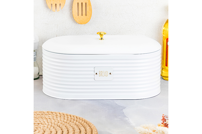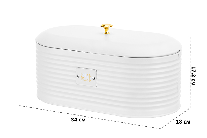 Хлебница с крышкой "Белая" размером 34х18х17,2 см выполнена из металла и поможет сохранить хлеб и булочки вкусными и свежими. Металлическая хлебница имеет стильный дизайн и украшена надписью "Bread" ("Хлеб"). Аккуратная ручка золотистого цвета на крышке придаёт изделию нарядный вид. Металлическая хлебница не впитывает запахи, держит температуру, предотвращает попадание влаги, а значит – защитит продукты от плесени. Настольная хлебница надежно закрывается металлической крышкой. Ёмкость можно приспособить не только под хлеб, но и для хранения пакетов с крекерами, печеньем, сухарями. Не рекомендуется применять абразивные моющие средства. Не подходит для использования в посудомоечной машине и микроволновой печи. Поставляется в картонной коробке. Металлическая хлебница подойдёт в подарок любой хозяйке. Такая посуда станет настоящим украшением вашей кухни и поможет создать в доме порядок и уют!