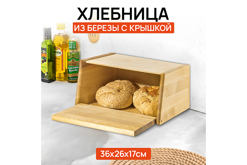 Хлебница Elan Gallery размером 36,5х26,5х17,5 см выполнена из березы — экологичного природного материала, прекрасно подходящего для хранения хлебобулочных изделий. Красивая хлебница из дерева поможет сохранить хлеб и булочки вкусными и свежими. Её особенность – необычный функционал 2 в 1. Вам больше не понадобится отдельная разделочная доска для того, чтобы нарезать хлеб или выпечку перед подачей на стол. Просто откройте откидную крышку в виде дверцы и используйте её как доску. Закрытая хлебница предотвращает попадание влаги и пыли на продукты и подойдёт к любому интерьеру кухни – от классического до лофт. Настольная хлебница имеет стильный дизайн и надежно закрывается крышкой. Декоративную ёмкость можно приспособить не только под хлеб, но и как органайзер для эстетичного хранения пакетов с крекерами, печеньем или сухарями. Этот кухонный инвентарь позволит не только удобно хранить булки или сладости в индивидуальных упаковках, но и станет предметом декора кухни в квартире или на даче. Используйте её как контейнер для хранения выпечки. Оригинальная хлебница из натурального природного материала подойдёт в подарок любой хозяйке. Подарите деревянную посуду женщине или мужчине на День Рождения, Новый год или другой праздник. В коллекции Elan Gallery вы можете найти много полезных кухонных принадлежностей из натуральных материалов. Такой аксессуар станет настоящим украшением вашей кухни или столовой и поможет создать в доме порядок и уют!