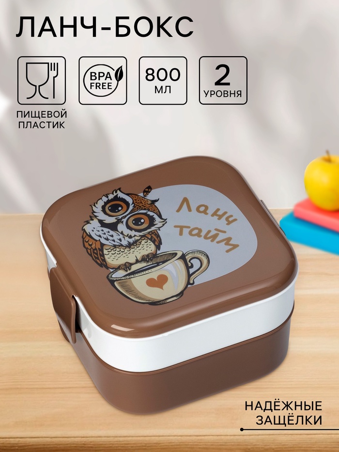 Ланч-бокс в школу IDEA «Совы», 2 отделения, 800 мл, 12.5×13×8.5 см, пластик, коричневый
