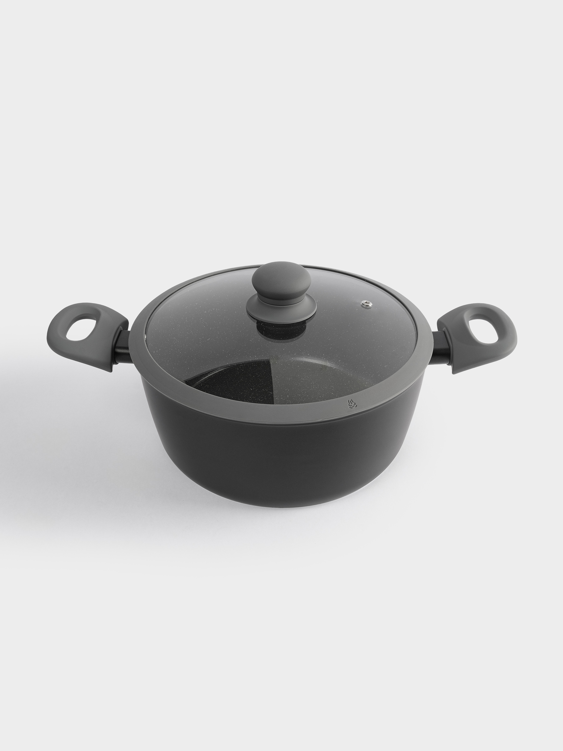 Кастрюля с крышкой. Размер: 24 см. Объем: 3,9 л. Материал: кованый алюминий с двухслойным антипригарным мраморным покрытием, крышка - термостойкое стекло с силиконовым ободком, ручки - бакелит с покрытием Soft touch. Двухслойное антипригарное мраморное покрытие безопасно для здоровья, т.к. не содержит PFOA (перфтороктановая и перфлюорооктановая кислоты); имеет гладкую поверхность, которая позволяет готовить с минимальным количеством масла и выдерживает нагрев до 260ºС; обладает высокой теплопроводностью, износостойкостью и устойчивостью к царапинам. Подходит для использования на всех типах плит, в том числе индукционных. Пустую посуду не подвергать воздействию высоких температур. Рекомендации по уходу: мыть вручную с применением мягких моющих средств. Не использовать для ухода абразивные чистящие средства и жесткие губки. Можно мыть в посудомоечной машине, но это приводит к появлению темного налета на внешней алюминиевой части дна (не влияет на потребительские характеристики самой посуды).
