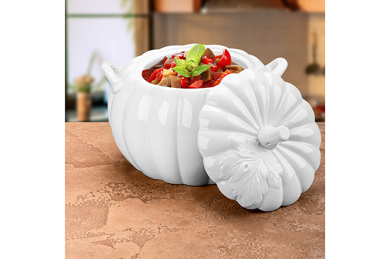 Кастрюля Elan Gallery «Тыква» предназначена для приготовления и красивой сервировки горячих блюд. Размер изделия – 24,5х23,5х19 см, объём – 4 литра. Выполнена из высококачественного белого фарфора, имитируя своим рельефом и формой тыкву. Предназначена для запекания в духовке блюд из мяса, рыбы, овощей и грибов. Приготовьте в ней жаркое, рагу, картофель со сметаной и зеленью. Вы можете подавать еду прямо в симпатичном горшочке и разнообразить сервировку стола. Изделие поможет хранить в холодильнике супы и домашние пельмени. Используйте его как супницу или пельменницу, подайте на праздничный стол, чтобы угостить большое количество гостей. Не подходит для приготовления блюд на открытом огне. Крышка и обе ручки оснащены техническими отверстиями – они служат в качестве пароотводов и не являются браком изделия. Не рекомендуется применять абразивные моющие средства. Подходит для использования в посудомоечной машине, микроволновой печи и духовом шкафу при температуре до 230 градусов. Поставляется в дизайнерской картонной коробке – благодаря ей вам не потребуется дополнительная подарочная упаковка. Подарите большую форму для запекания маме, бабушке, сестре или подруге на любой праздник. В коллекции бренда Элан Галерея вы найдёте стильный кухонный инвентарь, который всегда пригодится в хозяйстве. Жаропрочный горшок в форме тыковки станет украшением вашей кухни и удивит гостей на любой праздник!