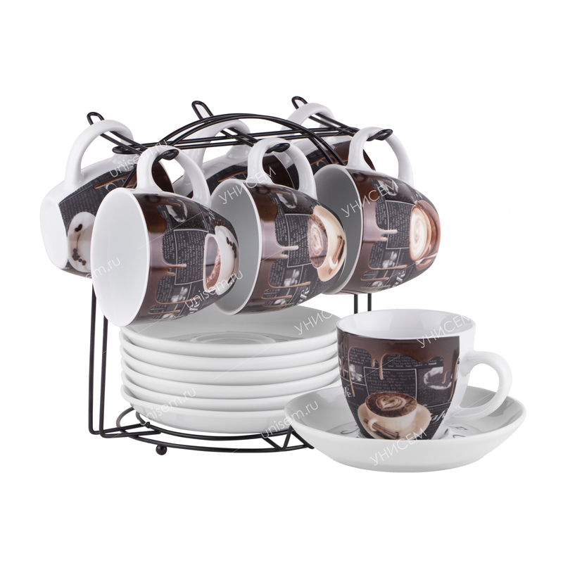 Представленный чайный набор будет отличным выборомдля бытового использования. Набор включает кружки 6 штук и блюдца 6 штук. Объём каждой кружки составляет 180 мл, изделия небольшие и очень удобные. Оформлены в приятном шоколадном дизайне, отлично дополняют самые разные интерьеры. Изделия поставляются с металлической подставкой, на которую можно ставить как кружки, так и блюдца.Преимущества:•особо чистая керамика;•оптимальные габариты для частных условий;•быстрая очистка традиционными способами и средствами.