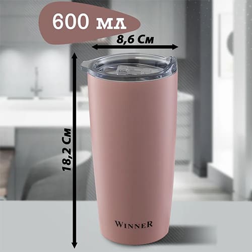 Кофейная кружка объемом 600 мл. Размер 8,6*18,2 см. Стенки двойные. Корпус розового цвета, внутри и снаружи нержавеющая сталь. Крышка пластиковая. Рекомендована ручная чистка. Состав: нержавеющая сталь, пластик.