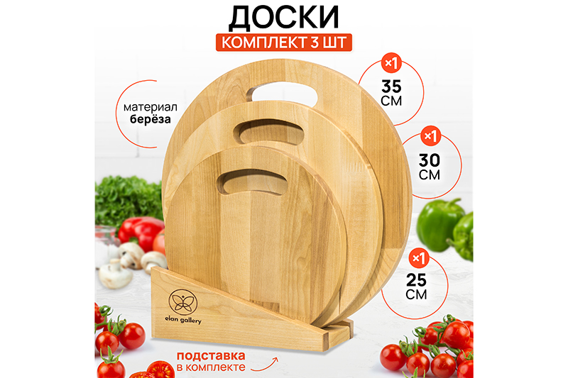 Набор состоит из трех разделочных досок и подставки. Круглые доски выполнены из березы и различаются по размеру: 35х35х1,8 см, 30х30х1,8 см и 25х25х1,8 см. Такой набор станет не только надежным помощником в резке продуктов, но и стильным украшением кухни. Доски имеют отверстия для подвешивания, что позволит при необходимости хранить доски по отдельности. Доски подходят для красивой сервировки пиццы, жареного мяса, овощей и прочих блюд. Доски уже пропитаны маслом. После каждого использования протирать влажной губкой. Не замачивать в воде. После мытья под струей воды протереть насухо. Не сушить около отопительных приборов и рядом с плитой. Хранить вертикально или в подвешенном состоянии в помещении с нормальным уровнем влажности. Не использовать в качестве подставки под горячее. Не мыть химическими средствами или в посудомоечной машине. Рекомендуется не реже одного раза в месяц обрабатывать все стороны растительным маслом. Так доска прослужит долго и будет радовать красотой и функциональностью! /