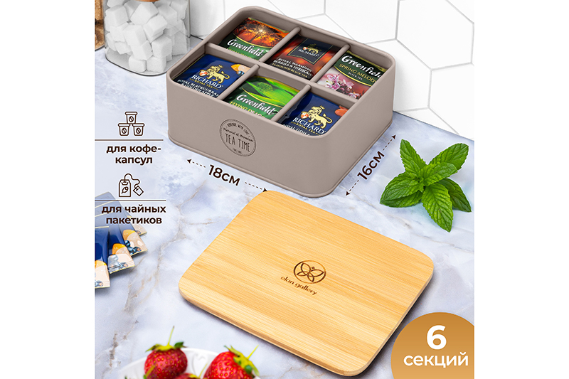 Органайзер для хранения чайных пакетиков от Elan Gallery – это идеальное решение для любителей чая. Стильная коробочка серого цвета выполнена из металла, имеет бамбуковую крышку. Размер 18,5х16х8 см. Имеет полностью съёмную крышечку и 6 одинаковых секций внутри. Размер каждой внутренней ячейки – 5,5х7,5х6,5 см. Высота контейнера без крышки 7 см. Металл в составе изделия обеспечивает его долговечность, а натуральный бамбук придаёт стиля и природной гармонии. Металлические стенки украшены лаконичной надписью "Tea time" ("Время чая"), а прямоугольная крышка – логотипом бренда. Благодаря стильному органайзеру с отсеками ингредиенты для заваривания любимого напитка будут всегда под рукой! Добавьте домашнему интерьеру стиля и комфорта. Крышечка защищает чайные пакеты от пыли и влаги. Ёмкость можно использовать для хранения капсул для кофемашины, пакетиков с растворимым кофе, фильтр-пакетов с травами. Удобно для пуэра в таблетках. Подойдёт в роли секционной банки для хранения разных видов чая. Храните сорта зелёного и чёрного чая в одной баночке и наслаждайтесь ежедневной дегустацией! Эта функциональная подставка станет предметом декора для интерьера вашей столовой. Шкатулка для чая – чудесный сюрприз на любой праздник для любителей чаепитий. Поставляется в красочной картонной коробке, поэтому не потребуется подарочная упаковка. Нельзя использовать абразивные моющие средства. Нельзя использовать в посудомоечной машине и микроволновой печи. Сделайте оригинальный подарок себе или близким – маленький ящик для чайных пакетиков украсит вашу кухню и поможет хранить всё необходимое в одном месте.