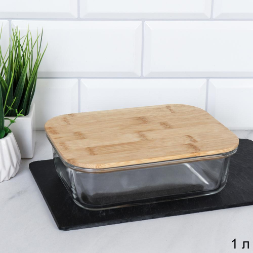 Контейнер прямоугольный крышка бамбук 370 мл стекло / P370 /уп 48/