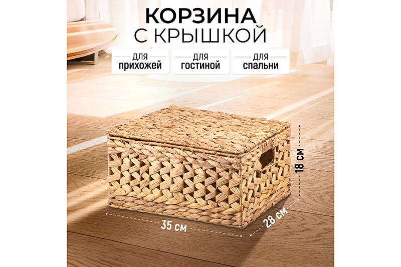 Плетёная корзинка с крышкой 35,5х28х18,5 см бежевого цвета подойдет для размещения в прихожей, гостиной, спальне или любой другой комнате. Стенки корзины представляют собой плетение из водного гиацинта – материала, который устойчив к влаге и перепадам температур. Такое преимущество позволяет использовать ящичек как небольшой комод на балконе или в ванной. Коробка имеет прочные стенки и дно. Плетёный дизайн придает корзине элегантный вид, что делает её не только функциональным, но и привлекательным элементом декора для вашего интерьера. Корзиночка для хранения поможет держать все на своих местах и создать уют в любой комнате. Разместите органайзер на полке для хранения шапок, перчаток, шарфов и платков. Универсальный ящик станет незаменимыми помощником для хранения косметики, украшений и любых аксессуаров и поможет сохранить их в безупречном состоянии. Подарите органайзер на любой праздник маме или бабушке, чтобы они смогли разместить в одном месте предметы для рукоделия, пряжи и вязания. Плетёная корзина – это практичное, стильное и эстетически приятное решение для организации хранения ваших аксессуаров. Доступ к вашим вещам станет простым и удобным!