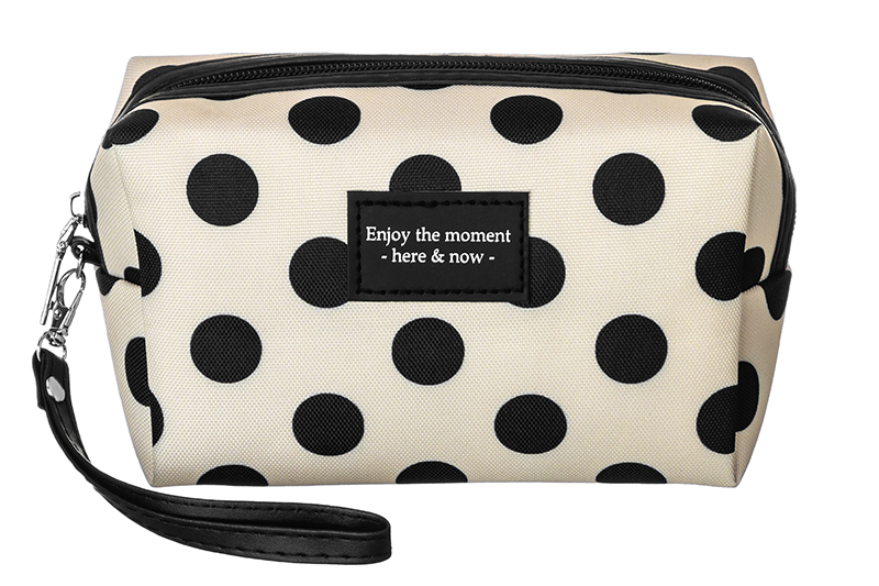 Косметичка-сумочка от ELCASA предназначена для компактного хранения косметики и аксессуаров. Размер изделия – 18х8х10,5 см. Выполнена из полиэстера с элементами из металла. Оснащена отстёгивающейся ручкой и замком-молнией с металлической собачкой. На поверхность изделия нашита надпись «Enjoy the moment – here & now» («Наслаждайтесь моментом – здесь и сейчас»). Красивый мягкий органайзер станет незаменимым дополнением домашнего инвентаря, позволяя удобно хранить даже большую коллекцию косметики! Заполните её палетками теней, баночками с кремами, губными помадами и принадлежностями для маникюра. Разложите аксессуары для волос – резинки, заколки или расчёски. Благодаря стильному белому дизайну в чёрный горошек косметичку можно хранить даже на видном месте, например, на полке или вешалке. Она гармонично дополнит любой интерьер! Прочная чёрная ручка обеспечит удобство при переноске, поэтому изделие выступит в роли практичной походной сумки. Возьмите её с собой в путешествие или поездку для перевозки разнообразных мелочей. Она послужит в роли дорожной аптечки для удобной транспортировки лекарств. Это не только оригинальный, но и функциональный подарок как для девочки, так и для женщины. Не рекомендуется применять абразивные моющие средства. В коллекции бренда ЭЛЬКАСА вы найдет большой ассортимент товаров для дома, которые помогут вам организовать бережную систему хранения ваших вещей!